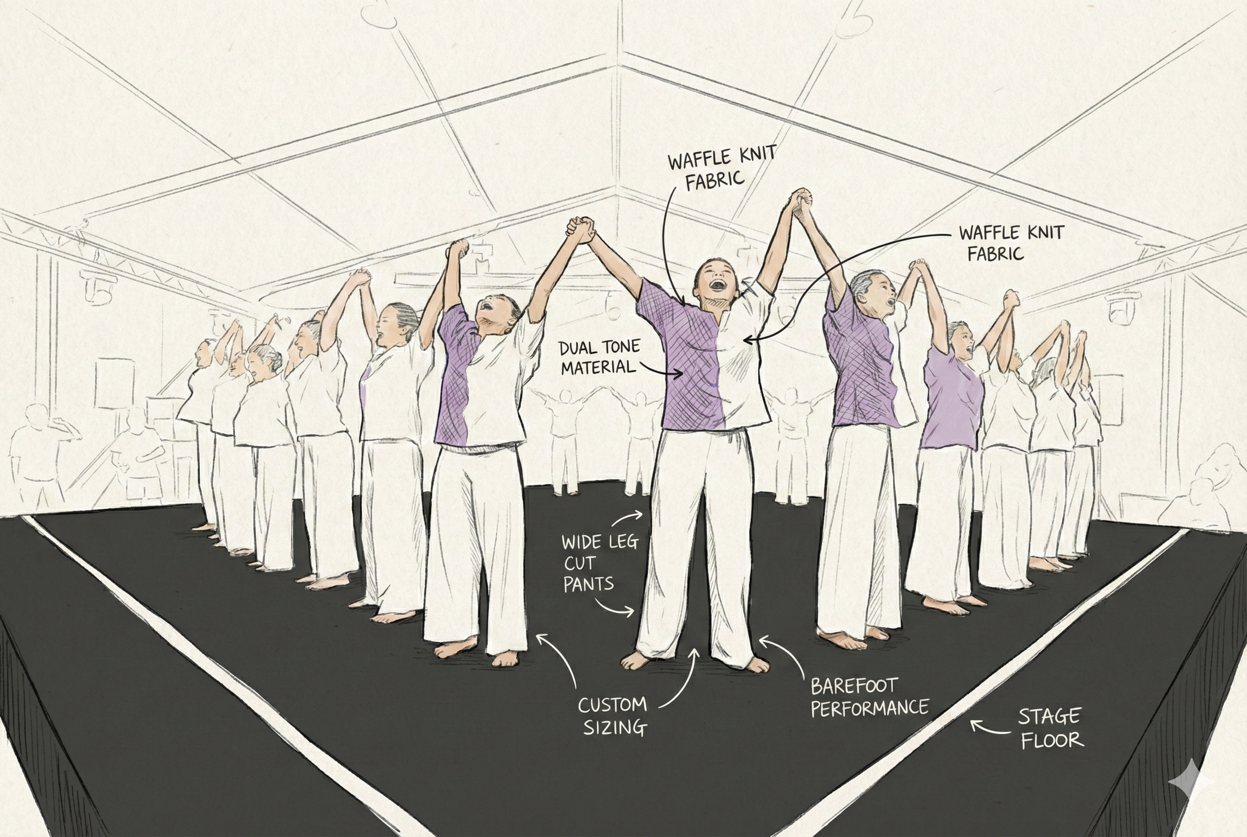Every garment patterned and sewn to spec — never printed on a pre-made blank.